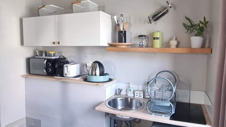 Das Ferienhaus bietet ein gemütliches Schlafzimmer, ein Wohnzimmer und eine voll ausgestattete Küchenzeile. Hier finden Sie alles, was Sie für einen komfortablen Aufenthalt benötigen, einschließlich Kühlschrank und Kaffeemaschine. Das Badezimmer verfügt über eine Dusche und kostenlose Pflegeprodukte. Handtücher und Bettwäsche werden gestellt, um Ihren Aufenthalt angenehm zu gestalten.