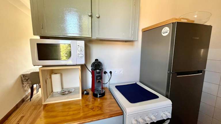 Die Unterkunft beinhaltet eine komplett ausgestattete Küche mit Kühlschrank und bietet somit die Möglichkeit zur Selbstverpflegung während des Aufenthalts.