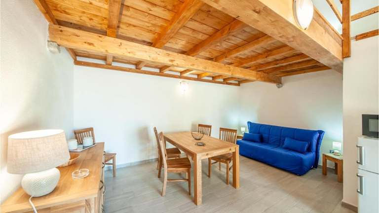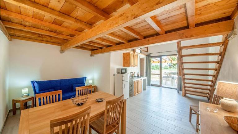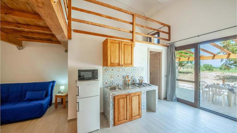 Das Ferienhaus umfasst ein Schlafzimmer, ein Wohnzimmer sowie eine voll ausgestattete Küche, die mit einem Kühlschrank und einer Mikrowelle ausgestattet ist.