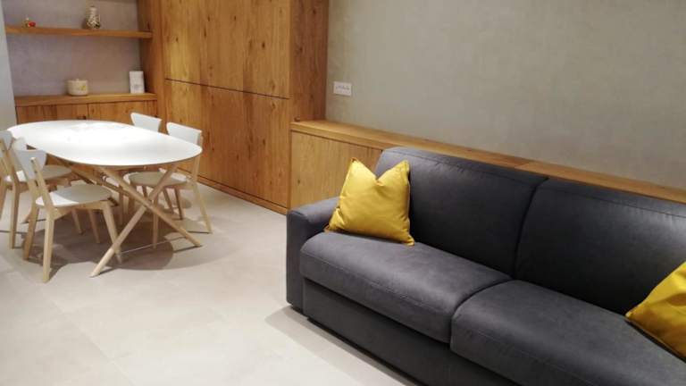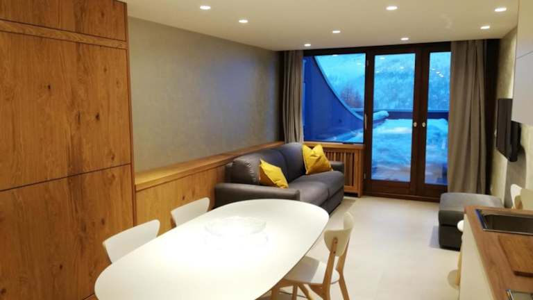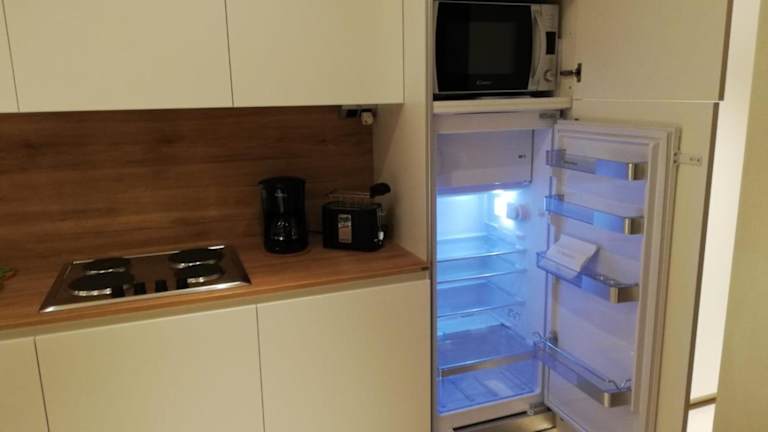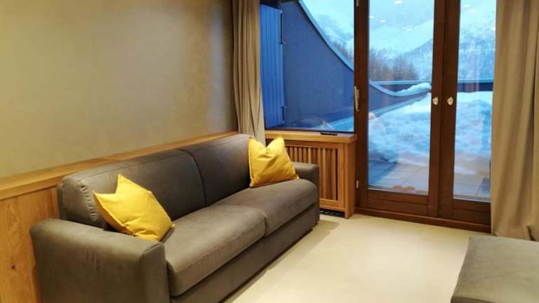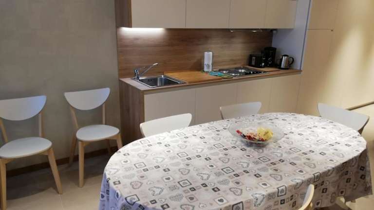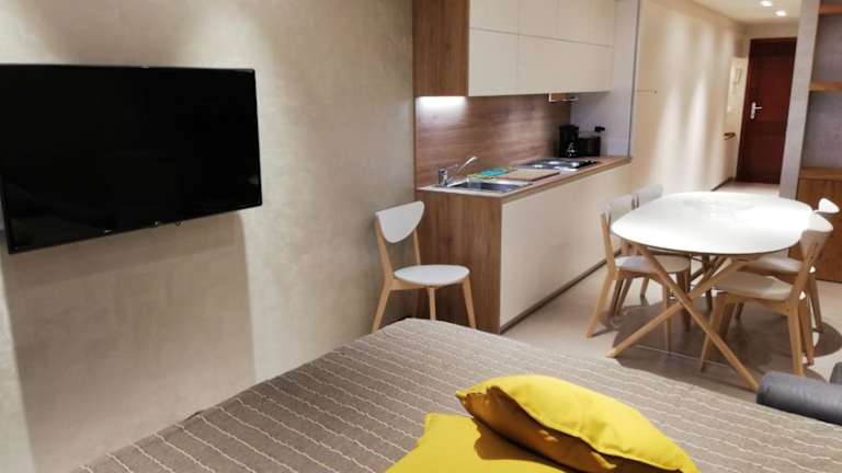 Die Ferienwohnung umfasst ein Schlafzimmer, ein Wohnzimmer und ein Badezimmer mit einem Bidet. Zur Ausstattung gehören ein Flachbild-TV sowie eine gut ausgestattete Küche mit Kühlschrank und Mikrowelle. Eine Terrasse mit Bergblick ist ebenfalls vorhanden. Handtücher und Bettwäsche können gegen Aufpreis bereitgestellt werden.