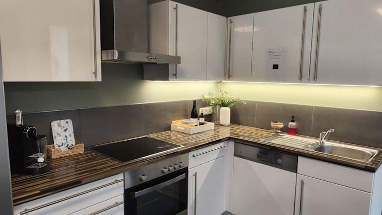 Die Ferienwohnung verfügt über 1 Schlafzimmer, ein Wohnzimmer mit einem Flachbild-TV, eine gut ausgestattete Küche, die einen Kühlschrank und Geschirrspüler umfasst, sowie ein Badezimmer mit Dusche. Eine Terrasse mit Blick auf den Garten steht ebenfalls zur Verfügung.