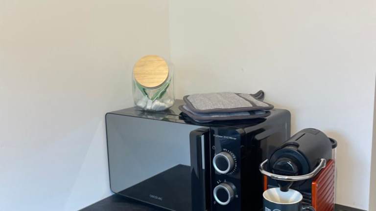 Die Ferienwohnung verfügt über eine voll ausgestattete Küche mit einem Kühlschrank und einer Kaffeemaschine, jedoch sind keine Informationen zu Verpflegungsmöglichkeiten vorhanden.