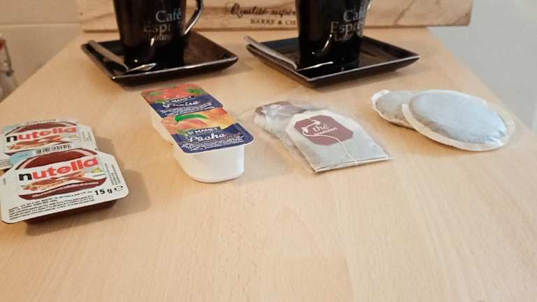 Die Ferienwohnung ist mit einer voll ausgestatteten Küche versehen, die einen Kühlschrank, einen Geschirrspüler, eine Mikrowelle sowie eine Kaffeemaschine und einen Wasserkocher umfasst.