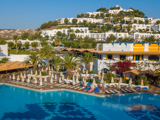Ruhig gelegen, etwa 50 Meter vom naturbelassenen Sandstrand entfernt. Der Ort Kardamena mit zahlreichen Unterhaltungsmöglichkeiten ist in circa 2 Kilometer erreichbar. Der Strand wird durch eine Straße vom Hotel getrennt und verfügt über einen eigenen Hotelabschnitt.