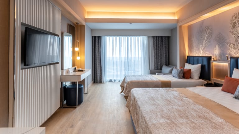 Das Lago Hotel verfügt über 493 Zimmer, die alle mit Klimaanlage, einem Flachbild-Sat-TV und einem eigenen Bad ausgestattet sind. Einige Zimmer bieten einen Patio oder einen Veranda und andere Zimmer haben einen Meer oder Waldblick. Zur weiteren Ausstattung gehören kostenlose Minibar, ein Safe, ein Wasserkocher und kostenfreie Pflegeprodukte.