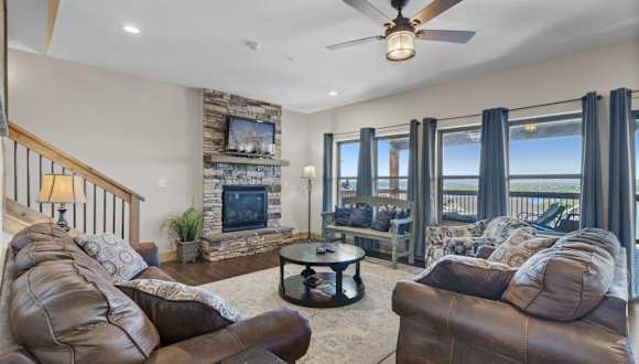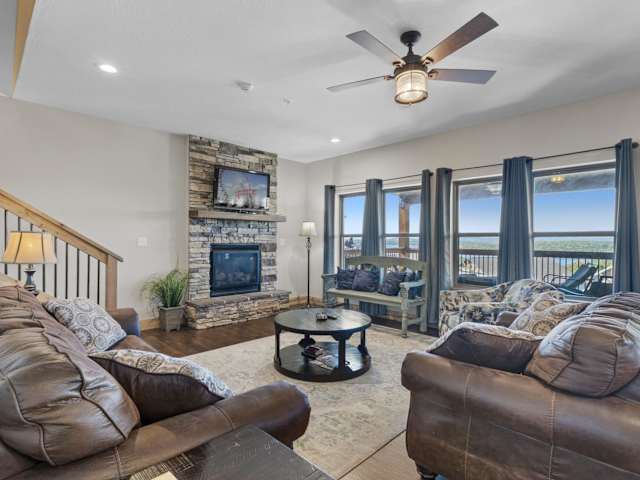 Lakefront Haven home bietet Übernachtungsmöglichkeiten in Form einer klimatisierten Lodge mit insgesamt 9 Schlafzimmern. Die Ausstattung umfasst eine moderne Küche mit Kühlschrank und Geschirrspüler, mehrere Badezimmer sowie ein wohnliches Ambiente mit TV und Sitzgelegenheiten.