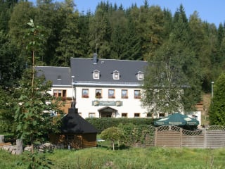 Die mit viel Liebe eingerichtete Gaststube bietet 35 Personen Platz und einen offenen Kamin. Nebenan befindet sich eine kleine Bauernstube mit 10 Sitzplätzen. Für Familienfeiern, Tanzveranstaltungen und Reise-gruppen steht ein Saal mit maximal 80 Plätzen zur Verfügung. Ein hübsch angelegter Bier- garten mit Teichlandschaft und finnischer Lappland-Grill- hütte für 12 Personen, bietet im Sommer Erholung in freier Natur.