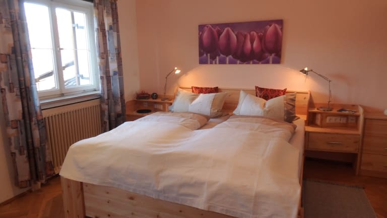 Gemütliche Ferienwohnung im 1.OG, ~ 98 m², Wohnzimmer, 2 Schlafzimmer, Küche, Bad, WC, Balkon, Holzböden aus Eiche, Fenster zum Öffnen, Balkon mit Sitzmöbel •Wohnzimmer mit großem Esstisch, Ecksofa, SAT-TV, Stereoanlage mit CD, USB, DAB+, BT; kleine Bibliothek und Spielesammlung. •zwei Schlafräume mit je einem Doppelbett, Tisch und Stühle, Einbauschränke •Wohn- und Schlafräume haben einen direkten Zugang zum Balkon. •In der Küche finden Sie eine hochwertige Einbauküche mit 4 Kochplatten, Backrohr, Geschirrspüler, Kühl- und Gefrierschrank, Toaster, Mikrowelle (auf Wunsch), Wasserkocher, Kaffeemaschine und vieles mehr. Geschirr ist ausreichend vorhanden. Tisch und Sitzgelegenheit bieten die Möglichkeit, beim Frühstück die Kühe zu beobachten. •Bad mit großzügiger Dusche, Waschtisch und WC. Schminktisch in Naturholz, zusätzliche Spiegel und Fön ergänzen die Ausstattung. •Ein zweites eigenständiges WC schafft Freiraum.