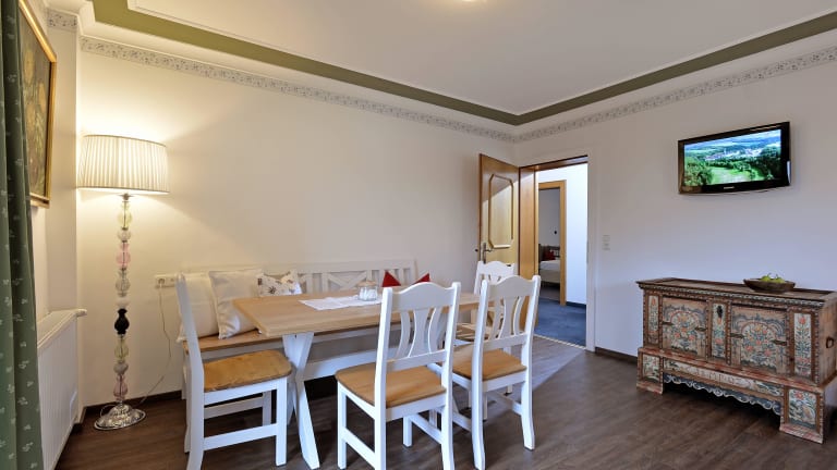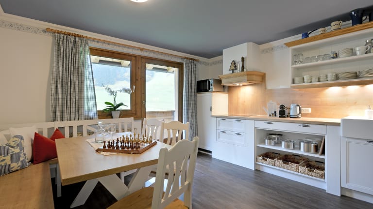 Ferienwohnungen mit Ausblick gegen Süden, ausgestattet mit Spülmaschine, Kühlschrank, 4- Plattenherd, Mikrowelle mit Backfunktion, Nespresso Kaffeemaschine, Wasserkocher, Toaster, Kochgeschirr, Essgeschirr, Gläser, Kabel-TV und W-Lan. Eigene Terrasse mit Gartenmöbel mit Blick zum Ahorn. 3 helle, gemütliche Doppelzimmer alle mit Du/WC, Fön, Safe, Balkon und Kabel-TV. Personenlift, Je Wohnung 2 Garagenplätze kostenlos