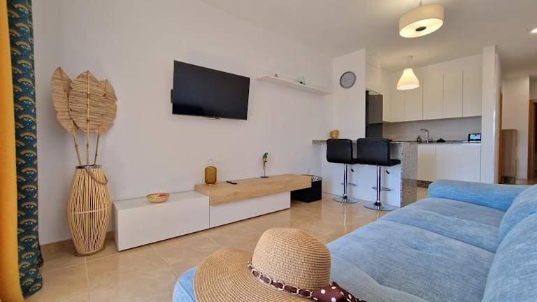 Die Unterkunft bietet ein modernes Apartment mit zwei Schlafzimmern, einem Wohnzimmer und einem Balkon mit Meerblick. Die gut ausgestattete Küche ermöglicht die Selbstverpflegung. Das Badezimmer enthält eine Dusche und ein Bidet.