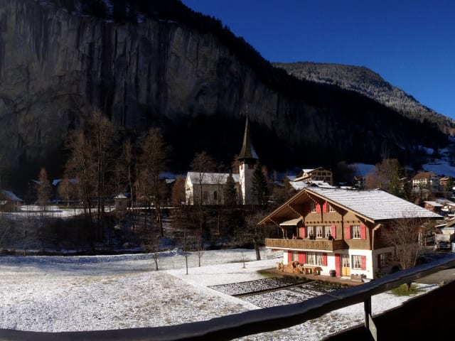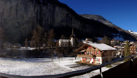 Haben Sie je davon geträumt, an heißer Schokolade zu nippen, sich zu entspannen und in die Stille hineinzuhorchen? Versteckt zwischen den majestätischen Bergen einer typisch schweizerischen Alpenkulisse ist die Stadt Lauterbrunnen für ihre landschaftliche Schönheit und die großartigen Staubbach-Wasserfälle gegenüber dieser Wohnung berühmt. Abenteuerlustige kommen hierher zum Drachenfliegen, Fallschirmspringen, Base-Jumping, Klettern oder Mountainbiken. Tolle Bergtouren mit herrlicher Aussicht auf Schritt und Tritt laden zum Fotografieren ein. Genießen Sie Wintersportarten wie Skifahren, Rodeln und Eislaufen, oder nutzen Sie die Sauna in der Wohnanlage. Andere Gäste kommen, um das üppige Grün und die Farben des Sommers, die saubere Luft und das klare Wasser zu genießen. Die Zeit, die Sie auf dem Balkon verbringen, wirkt immer belebend. Während die Wasserfälle endlos scheinen und die Weiße Lütschine vorbeieilt, können Sie darüber nachsinnen, wie Sie Ihren Tag verbringen wollen. Ruhe, Entspannung und Erholung im Appartement „Ruhe in EyHus 5“ Ideal für ein Paar, das einen ruhigen Ort zum Ausspannen sucht. Einen großen Tisch, um die Zeitung auszubreiten oder eine gemütliche Ecke, um sich dort mit einem Buch einzuigeln. Vielleicht spüren Sie, wie sich Ihr Geist erneuert, während Sie die hypnotisierenden Staubbach-Wasserfälle von Balkon, Wohnzimmer oder Schlafzimmer betrachten. Beobachten Sie das Wasser, das sich in schäumenden Kaskaden den Abhang hinunterstürzt. Nachts wunderschön beleuchtet, rauschen die Wasserfälle immerzu. Im Winter hören Sie gelegentlich als Wiederhall von den schneebedeckten Gipfeln unten im Tal, wie das Eis lautstark bricht, ein Geräusch, dass Sie daran erinnert, dass die Natur lebendig ist. Jede Jahreszeit hat ihre besonderen Merkmale, aber Sie können stets erleben, wie der Bach am EyHus friedlich gurgelnd seine Geheimnisse preisgibt. Dieses 50 m2-Nichtraucher-Appartement (Haustiere nicht erlaubt) im ersten Stockwerk, ist behaglich eingerichtet, Tappich und verfügt über regulierbare Zentral- bzw. Fußbodenheizung. 1 Schlafzimmer mit großem Doppelbett, reichlich Platz im Schrank und Blick auf die Staubbach-Wasserfälle. Beobachten Sie das Wasser, das sich in schäumenden Kaskaden den Hang hinunterstürzt. Nachts wunderschön beleuchtet, rauschen die Wasserfälle fortwährend weiter. Das Wohnzimmer verfügt über 2 Schlafsofas, CD-Spieler, W-LAN-Internet (5 MB) und Fernsehapparat (86 Kanäle – „Sunrise Basic“). Lautsprecher für IPod, Blick auf die Staubbach-Wasserfälle. Praktische offene Küche (3 Kochplatten, Backofen, Mikrowelle, Raclette-Set, Reiskocher, Wok), Ausgang zum Balkon. Dusche/WC, Haartrockner, Bügeleisen und Bügelbrett, Tischtennisschläger/Tischtennisbälle. Überdachter Balkon Richtung Staubbachfälle mit freiem Blick. Vorhänge und Fensterläden, die das Licht abschirmen, damit Sie ausschlafen können. Wir haben einen Raum für die Erholung geschaffen. Bitte beachten Sie: nur Nichtraucher, keine Haustiere. EyHus ist eine kleine, ruhige Wohnanlage mit sieben Parteien. Eigene Waschmaschine, Trockner, Badewanne und Kofferabstellraum, gemeinsam genutzter Abstellraum für Skier mit eigenem Ski-Spind, Tischtennis, Sauna/Dusche (35 min für 1 CHF) sind vorhanden. Ganzjährig Zugang mit exklusiver Nutzung des überdachten Stellplatzes. An der Busstrecke sowohl zur Seilbahnstation Schilthorn, zum Skilift Mürren/Schilthorn als auch nach Lauterbrunnen, wo der Zug nach Wengen/Kleine Scheidegg abfährt. Gratis-Ski-Bus im Winter. 15 Gehminuten zum Bahnhof Lauterbrunnen. Dort gibt es tolle Käsegeschäfte, Metzgereien und Bäckereien sowie Ski-Verleih, Fahrradläden, Friseur, Uhren- und Geschenkläden, Gaststätten, Cafés, 2 Banken, Post, Tankstelle, Fremdenverkehrsbüro (sehr hilfreich), Abenteuersportarten, Schwimmbad, Minigolf, Tennis, (Langlaufloipe nach Stechelberg), Geocaching und Supermarkt. Der Spaziergang dauert ein wenig länger, wenn Sie sich die Zeit nehmen, die Lütschine und die schöne Aussicht zu genießen, und Platz nehmen, um die Berge von dem nach Süden ausgerichteten Platz nahe EWL zu malen. (Wir denken, dass J.R.R. Tolkien an dieser Stelle gemalt hat, um sich für Rivendell in 'Herr der Ringe' inspirieren zu lassen.) 3 Star Accreditation from the Swiss Tourism Federation