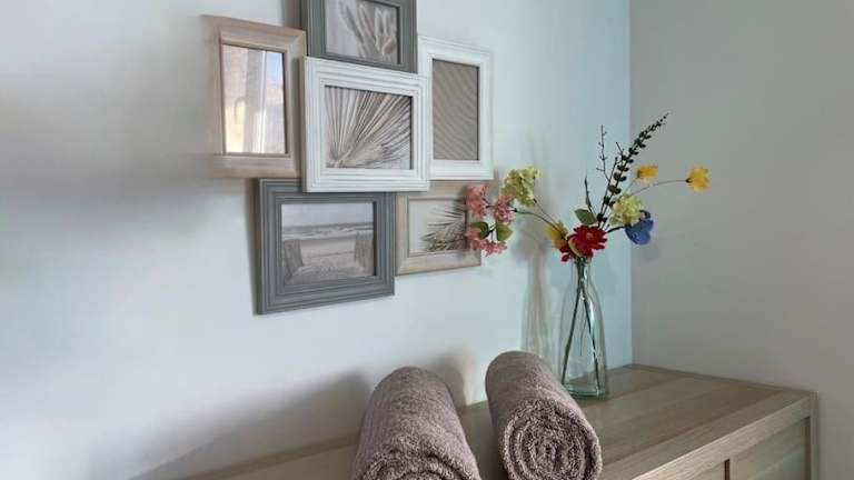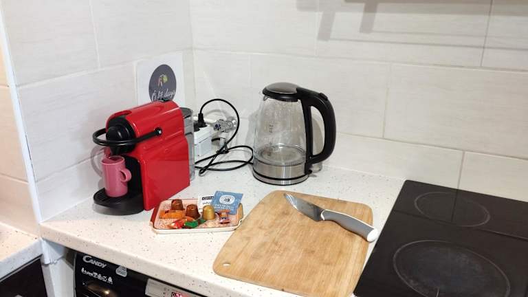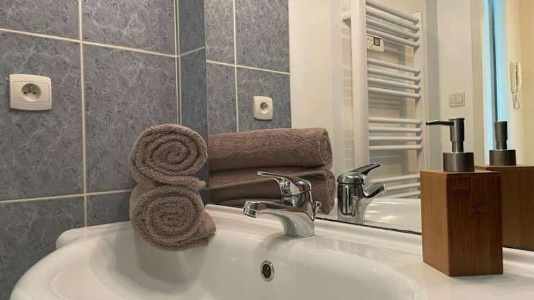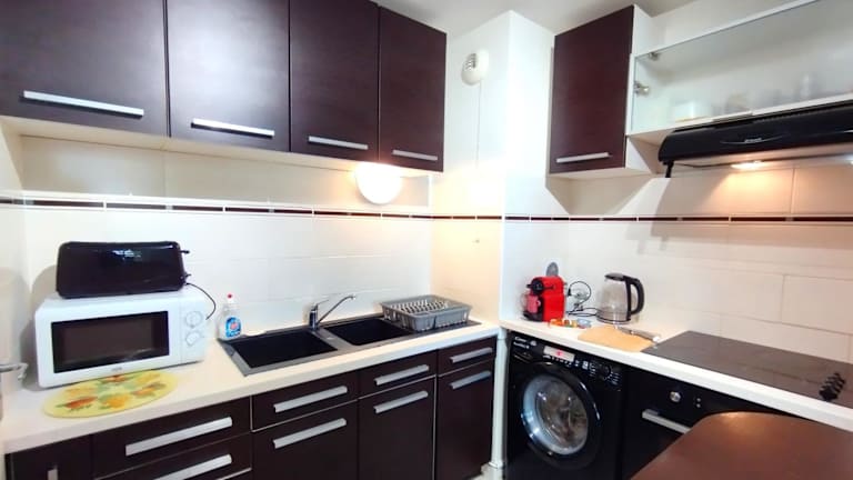 Die Wohnung umfasst ein Schlafzimmer, ein Wohnzimmer mit einem Flachbild-TV, eine gut ausgestattete Küche, die mit einem Kühlschrank und einem Ofen ausgestattet ist, sowie ein Badezimmer mit Badewanne. Handtücher und Bettwäsche werden bereitgestellt.