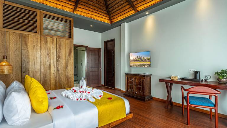 Das Le Chanthou Boutique Resort bietet modern gestaltete Villen mit Poolblick. Die Unterkünfte sind lokal inspiriert und verbinden traditionelles Design mit modernem Komfort. Für Familienreisende stehen zwei Familien-Villen mit eigenem Pool zur Verfügung. Jede Villa bietet einen angenehmen Rückzugsort und lädt zum Entspannen ein.