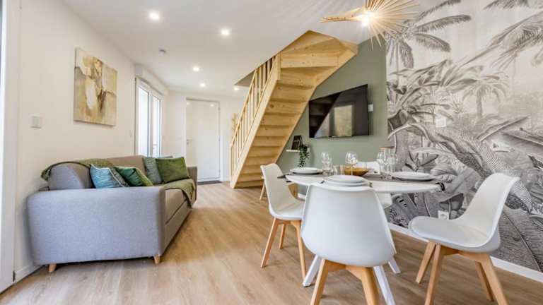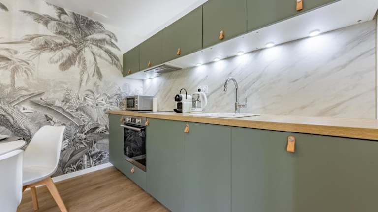 Das klimatisierte Apartment im Le Green Duplex - Netflix - Melina & Alfred bietet eine komfortable Unterkunft für Ihren Aufenthalt. Das Apartment verfügt über ein gemütliches Schlafzimmer, ein geräumiges Wohnzimmer und eine voll ausgestattete Küche mit Kühlschrank und Kaffeemaschine. Das Badezimmer ist mit einer Dusche und einem Haartrockner ausgestattet. Handtücher und Bettwäsche werden im Apartment gestellt, sodass Sie sich um nichts kümmern müssen.