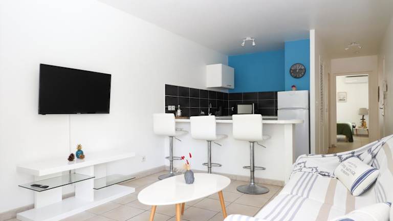 Die Ferienwohnung verfügt über eine Klimaanlage und besteht aus einem Schlafzimmer, einem Wohnzimmer sowie einer voll ausgestatteten Küche mit Kühlschrank und Kaffeemaschine. Ein Badezimmer mit Dusche ist vorhanden. Handtücher und Bettwäsche werden bereitgestellt.