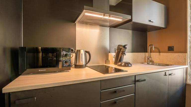Die Unterkunft bietet eine Küche, die mit einem Kühlschrank, einer Mikrowelle, einer Kaffeemaschine und einem Wasserkocher ausgestattet ist.