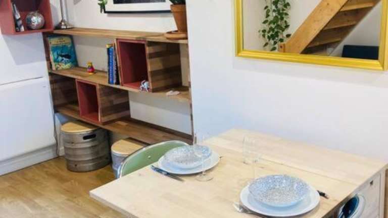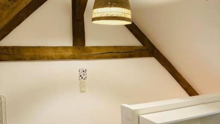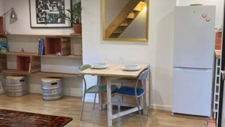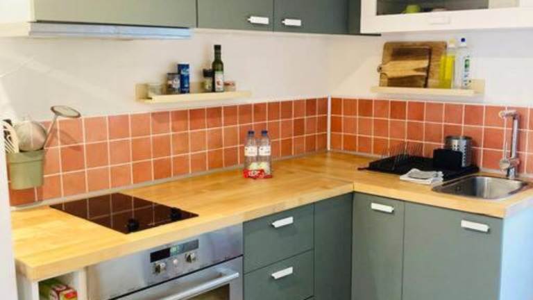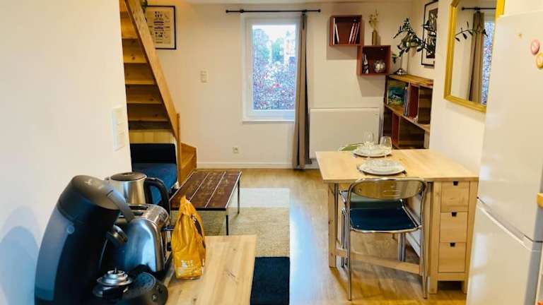 Die Wohnung verfügt über ein Schlafzimmer sowie eine Küche, die mit einem Kühlschrank und einer Mikrowelle ausgestattet ist. Eine Waschmaschine steht ebenfalls zur Verfügung.