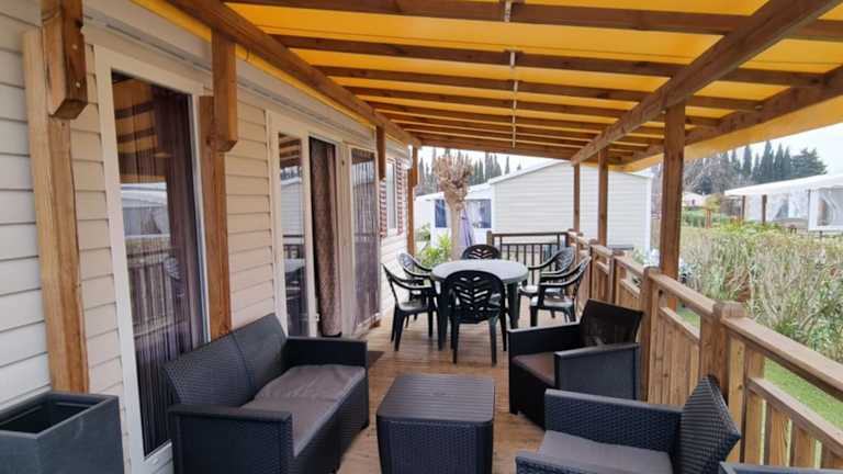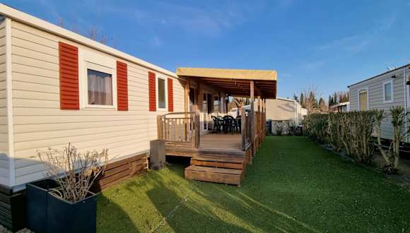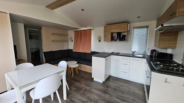 Die Wohneinheiten sind mit Klimaanlage, einem Wohnzimmer mit Schlafsofa, einem Flachbild-TV sowie einem eigenen Badezimmer mit Haartrockner und Dusche ausgestattet. Jedes Mobilhome hat eine gut ausgestattete Küche mit Kühlschrank, Geschirrspüler, Ofen, Mikrowelle, Kaffeemaschine und Wasserkocher. Zudem gibt es Sitzgelegenheiten und einen Essbereich in den Unterkünften.