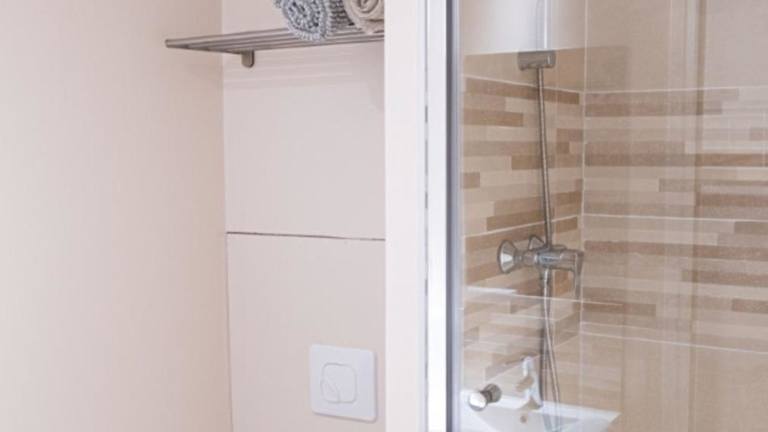 Die Ferienwohnung umfasst ein Schlafzimmer, eine Küchenzeile mit Kühlschrank und Mikrowelle sowie ein Badezimmer mit Dusche und Haartrockner. Handtücher und Bettwäsche werden bereitgestellt.