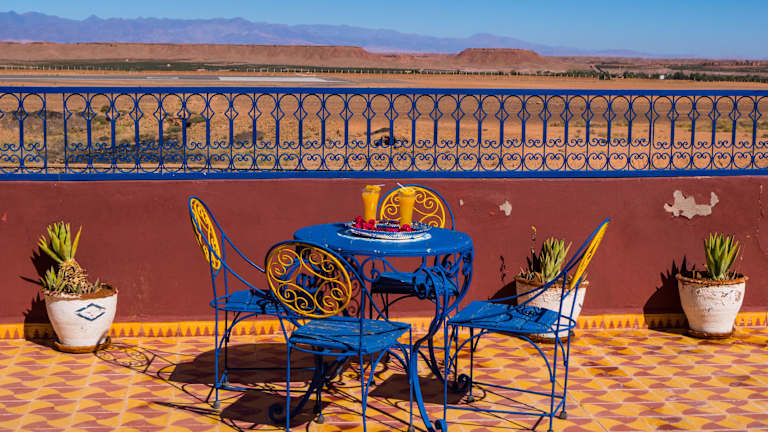 Das Le Petit Riad Maison d'hôtes in Ouarzazate ist ein charmantes Hotel im Berber-Stil, das sich durch seine einzigartige Architektur und seine entspannte Atmosphäre auszeichnet. Der zentrale, gekachelte Brunnen und der Außenpool bieten eine idyllische Kulisse für einen erholsamen Aufenthalt. Die klimatisierten Zimmer bieten einen wunderschönen Blick auf die Berge, die Terrasse oder den Pool und verfügen über ein eigenes Bad mit Dusche und kostenfreien Pflegeprodukten. Das Hotel bietet auch ein köstliches kontinentales Frühstück und ein Restaurant, in dem Sie marokkanische Spezialitäten genießen können. Die Mitarbeiter des Hotels sind freundlich und stehen Ihnen gerne bei der Organisation von Ausflügen und Sightseeingtouren zur Seite.