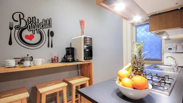 Es stehen Kochmöglichkeiten mit einer voll ausgestatteten Küche bereit, die mit Kühlschrank, Geschirrspüler, Mikrowelle, Kaffeemaschine und Wasserkocher ausgestattet ist.