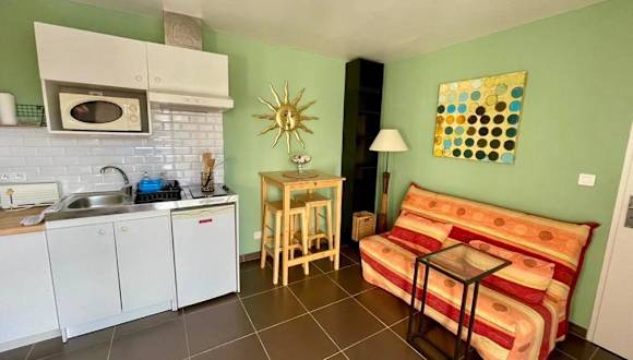 Die Küchenzeile des Studios ist mit einem Kühlschrank, einer Mikrowelle, einer Herdplatte sowie einer Kaffeemaschine und einem Wasserkocher ausgestattet, womit die Selbstverpflegung der Gäste ermöglicht wird.