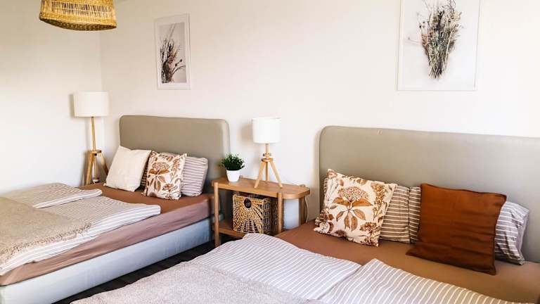 Die Ferienwohnung umfasst 3 Schlafzimmer, ein Wohnzimmer, eine gut ausgestattete Küche mit Kühlschrank und Geschirrspüler sowie 2 Badezimmer mit Dusche. Zudem sind ein Flachbild-TV sowie eine Terrasse und Stadtblick vorhanden. Handtücher und Bettwäsche werden bereitgestellt.