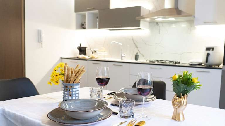 Die Unterkunft bietet eine voll ausgestattete Küche, in der die Gäste ihre eigenen Mahlzeiten zubereiten können. Es sind keine Informationen zu weiteren Verpflegungsmöglichkeiten vorhanden.