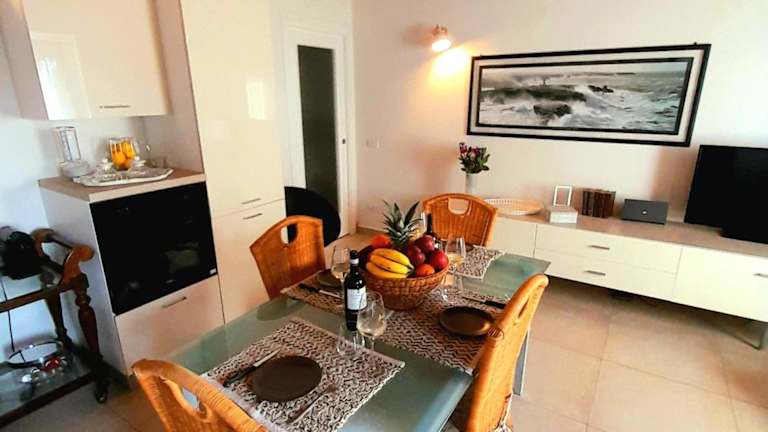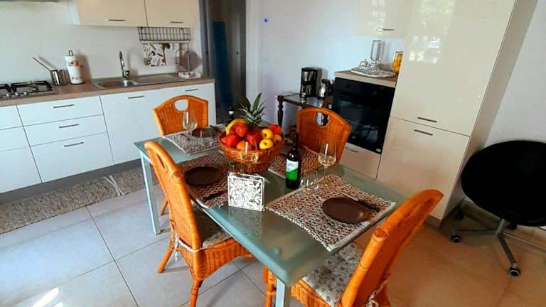 Die Ferienwohnung ist mit einer voll ausgestatteten Küchenzeile ausgestattet, die den Gästen die Zubereitung eigener Mahlzeiten ermöglicht. Ein Essbereich steht ebenfalls zur Verfügung.