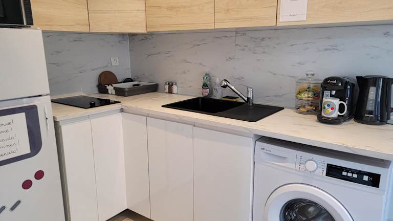 Essenslieferungen in die Unterkunft sind möglich. Es stehen außerdem verschiedene Küchenausstattungen zur Verfügung, einschließlich einer voll ausgestatteten Küche mit Kühlschrank und Kaffeemaschine.