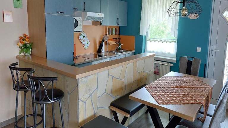 Die Ferienwohnung ist ausgestattet mit Bettwäsche, Handtüchern und einem TV mit Kabelkanälen. Zur Ausstattung gehört außerdem eine voll ausgestattete Küche.