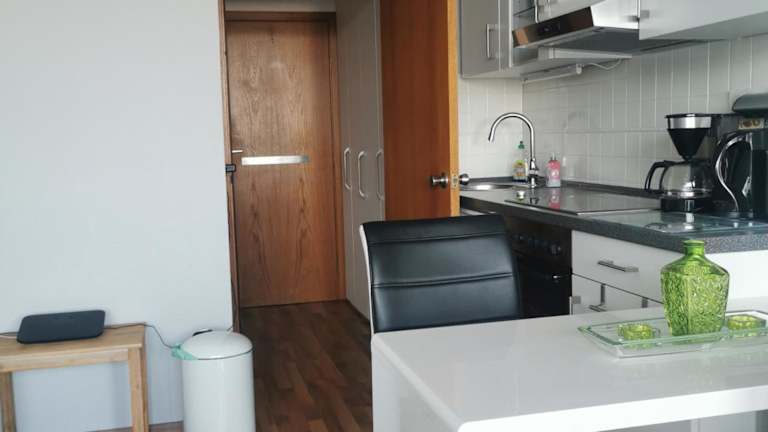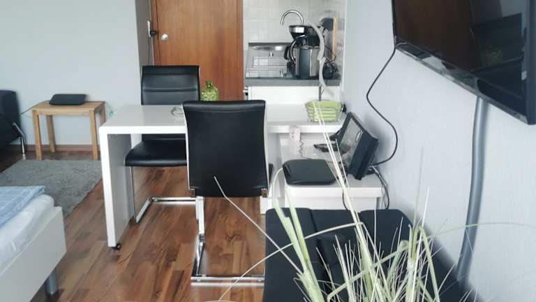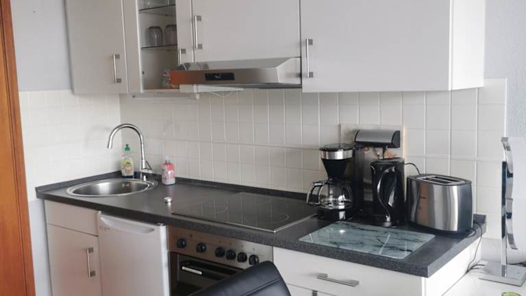 Die Ferienwohnung verfügt über einen Balkon, ein Wohnzimmer und einen Flachbild-TV. Die Küchenzeile ist mit einem Kühlschrank, einem Ofen, einer Herdplatte, einer Kaffeemaschine und einem Wasserkocher eingerichtet.