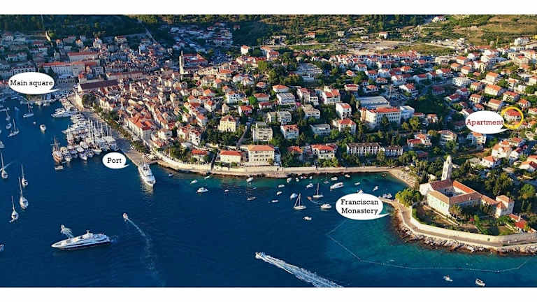 Die Unterkunft befindet sich in Hvar, nur 200 m vom Strand am Franziskanerkloster und 400 m vom Stadthafen Hvar entfernt. In der Umgebung gibt es interessante Sehenswürdigkeiten wie das Hvar Theater und Arsenal, den St. Stephen's Platz in Hvar und die St. Stephen's Kathedrale in Hvar. Der nächstgelegene Flughafen ist der Flughafen Split, der sich 82 km entfernt befindet.