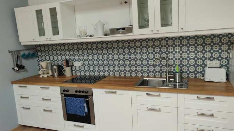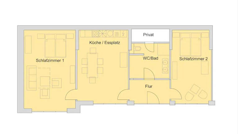 Die Ferienwohnung umfasst zwei Schlafzimmer, ein Wohnzimmer mit Flachbild-TV und eine gut ausgestattete Küche. Ein Badezimmer mit Dusche ist ebenfalls vorhanden. Handtücher und Bettwäsche werden bereitgestellt.