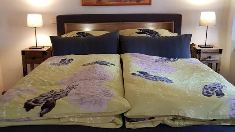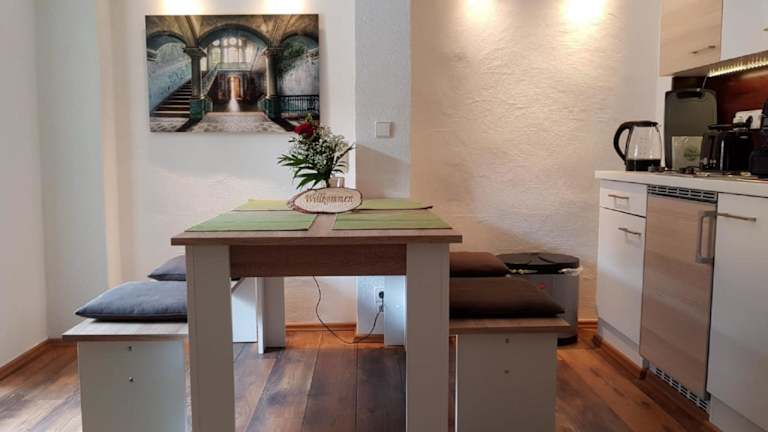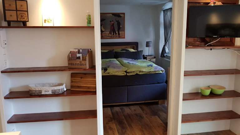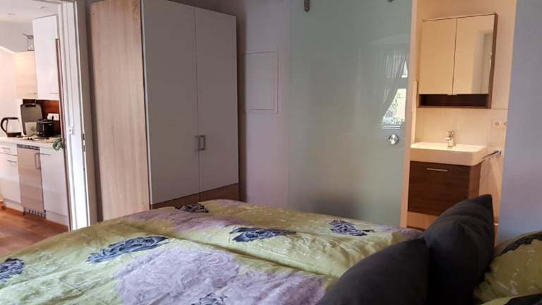 Die Ferienwohnung verfügt über ein separates Schlafzimmer, eine voll ausgestattete Küche mit Kühlschrank und Herdplatte sowie ein Badezimmer.