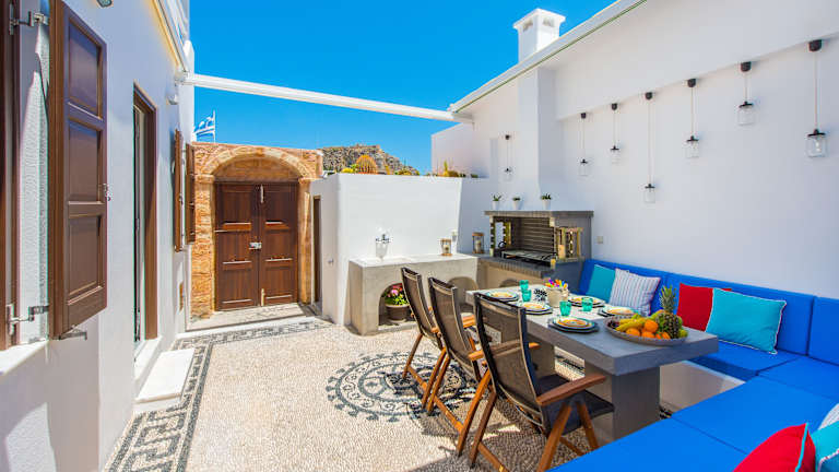 Die Lindos Allure Villa erstreckt sich über 2 Ebenen und bietet eine elegante und komfortable Einrichtung. Der private Innenhof mit einem Steingrill und einer Terrasse bietet einen wunderschönen Blick auf die Ägäis und die Akropolis von Lindos. Die Villa verfügt über zwei separate Schlafzimmer mit Matratzen von Coco-Mat und zwei Wohnzimmer mit Schlafsofas, die durch einen elektronischen Teiler getrennt sind. Ein Flachbild-Kabel-TV und eine voll ausgestattete Küche mit Geschirrspüler und Mikrowelle stehen ebenfalls zur Verfügung. Die Badezimmer sind mit Duschkabinen mit Hydromassage-Einrichtungen und Bademänteln ausgestattet. Eine Waschmaschine und ein Wäschetrockner sind ebenfalls vorhanden, um Ihren Aufenthalt so angenehm wie möglich zu gestalten.