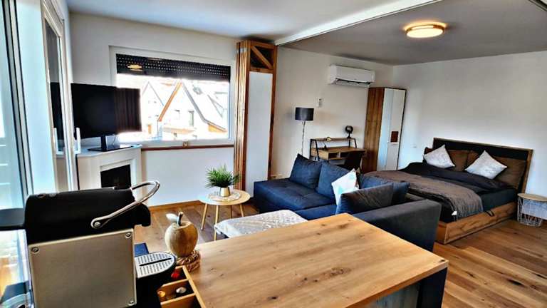 Die Wohnung bietet ein Schlafzimmer, ein Wohnzimmer und eine voll ausgestattete Küche mit Kühlschrank und Kaffeemaschine. Die sanitären Anlagen umfassen ein Badezimmer mit Dusche und kostenlosen Pflegeprodukten. Handtücher sowie Bettwäsche sind vorhanden, des Weiteren sind die Zimmer klimatisiert und schallisoliert.