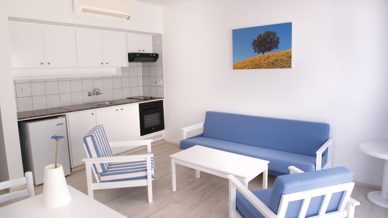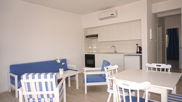 Die Apartments im Liquid Hotel sind stilvoll eingerichtet und in weißen, orangen und hellblauen Farben gehalten. Jede Unterkunft verfügt über ein separates, klimatisiertes Schlafzimmer und eine offene Küche mit einem Sitz- und Essbereich. Zur Ausstattung gehören ein Flachbild-Sat-TV, ein Minikühlschrank, ein Wasserkocher und ein Kochfeld. Jedes Apartment verfügt über einen Balkon mit Blick auf den Pool oder die Umgebung.