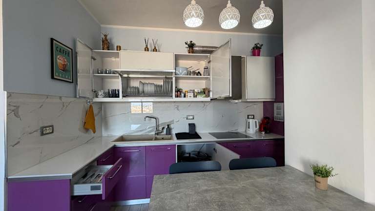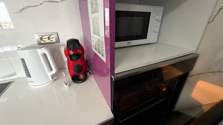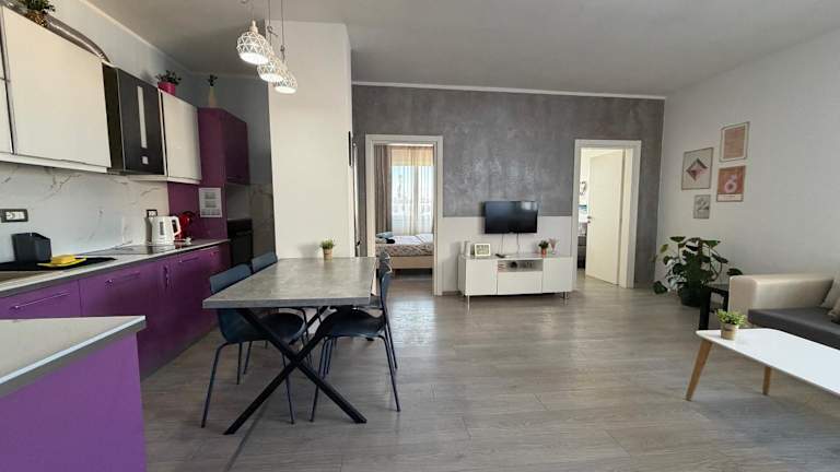 Die Ferienwohnung besteht aus 2 Schlafzimmern, einem Wohnzimmer und einer voll ausgestatteten Küche, die einen Kühlschrank und einen Wasserkocher umfasst. Des Weiteren ist ein Badezimmer mit Bidet und Dusche vorhanden. Handtücher und Bettwäsche werden bereitgestellt.