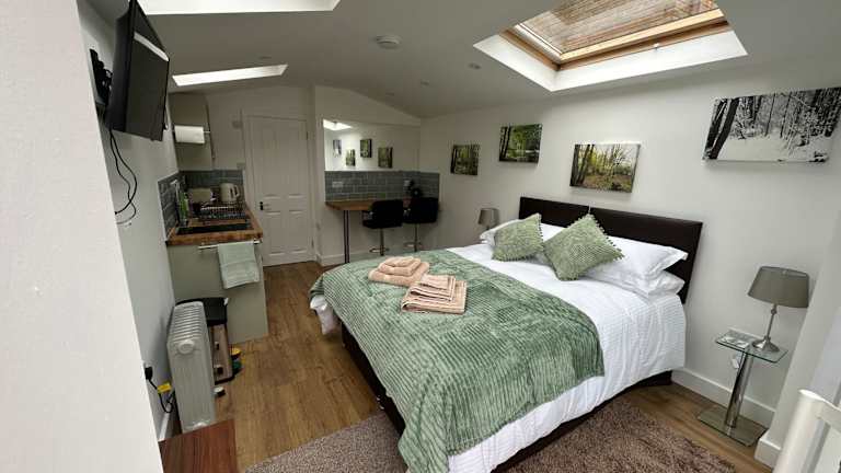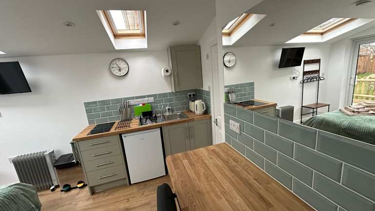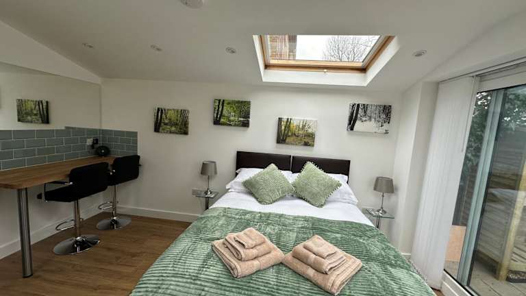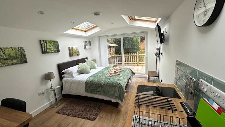 Die Ferienwohnung bietet 1 Schlafzimmer und 1 Badezimmer. Zur Ausstattung gehören Bettwäsche, Handtücher, ein Flachbild-TV, ein Essbereich sowie eine voll ausgestattete Küche. Die Terrasse ermöglicht einen Blick auf den Garten.