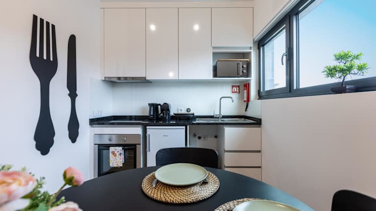 Jede Wohneinheit verfügt über eine voll ausgestattete Küche mit einem Esstisch sowie einem Kühlschrank, einem Ofen, einer Mikrowelle, einer Kaffeemaschine und einem Wasserkocher.