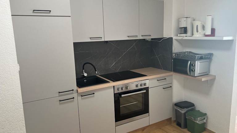 Die Ferienwohnung bietet einen Balkon, ein Schlafzimmer, ein Wohnzimmer und eine gut ausgestattete Küchenzeile für die Selbstversorgung.