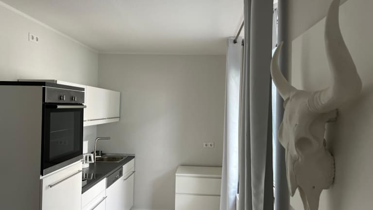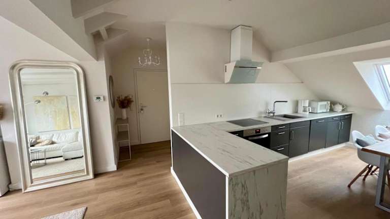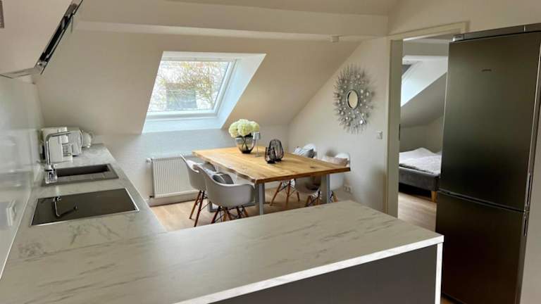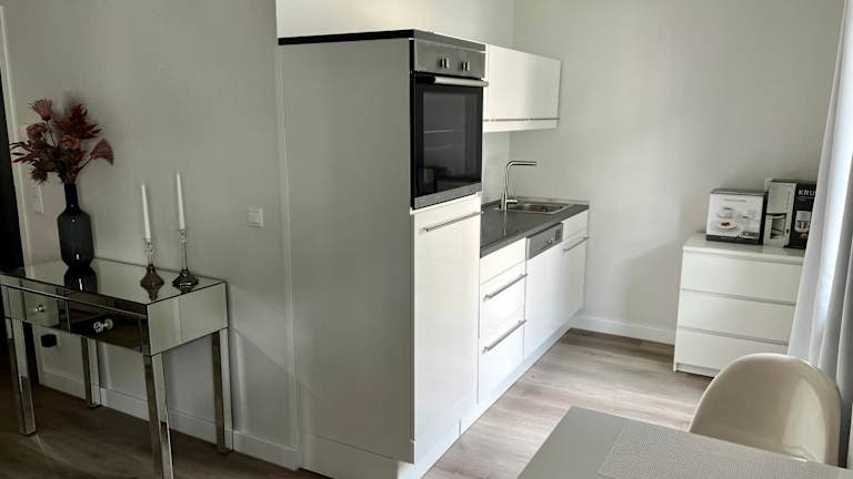 Die Ferienwohnung umfasst eine Küchenzeile mit einem Kühlschrank, einem Geschirrspüler und einem Ofen. Zudem ist ein modernes Bad vorhanden, das mit einer Dusche, kostenlosen Pflegeprodukten und einem Haartrockner ausgestattet ist.