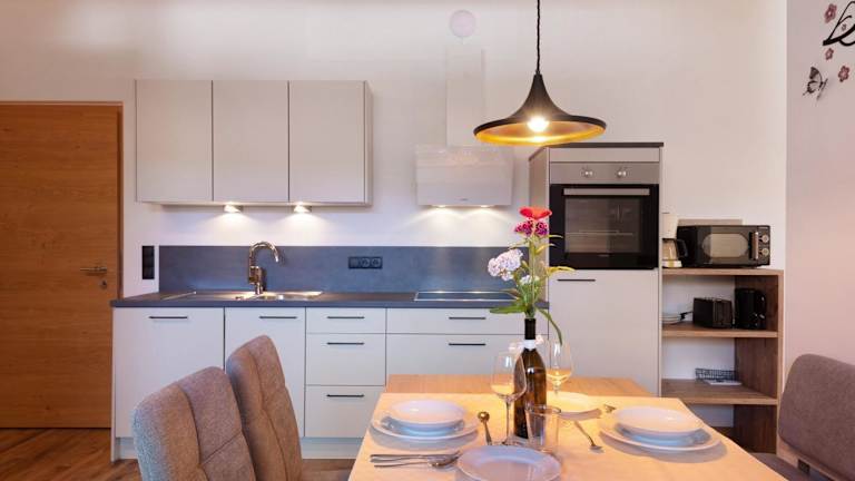 Die Ferienwohnung umfasst 1 Schlafzimmer, ein Wohnzimmer, ein Badezimmer mit Dusche sowie eine gut ausgestattete Küche mit Geschirrspüler und Ofen. Handtücher und Bettwäsche werden bereitgestellt.