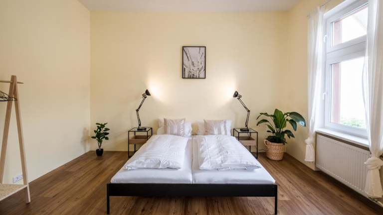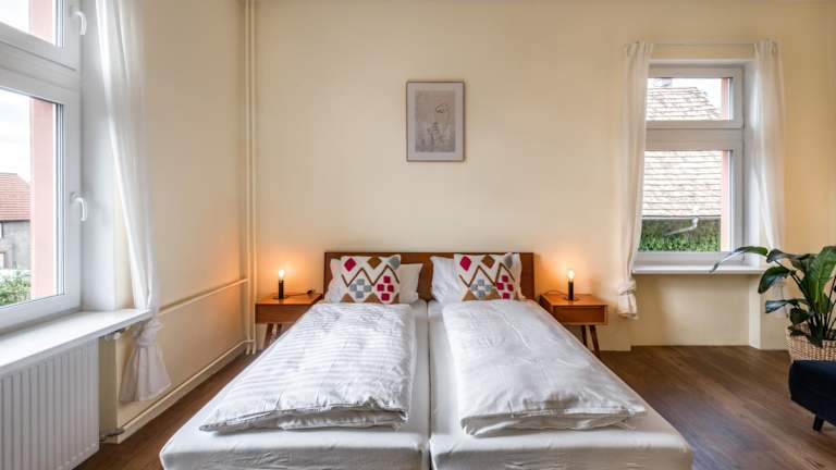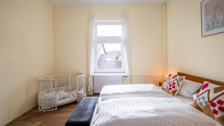 Die Ferienwohnung bietet drei Schlafzimmer, ein Wohnzimmer sowie eine gut ausgestattete Küche. Es gibt ein Badezimmer, das sowohl mit einer Dusche als auch einer Badewanne ausgestattet ist. Die Unterkunft ist mit einem Satelliten Flachbild-TV, Handtüchern und Bettwäsche ausgestattet. Der Balkon und der Gartenbereich laden zum Verweilen ein.