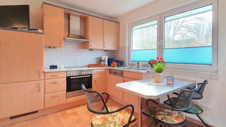 Das Ferienhaus Löwenzahn ist mit einem TV ausgestattet und bietet eine voll ausgestattete Küche mit Kühlschrank, Geschirrspüler, Backofen, Kaffeemaschine und Wasserkocher.