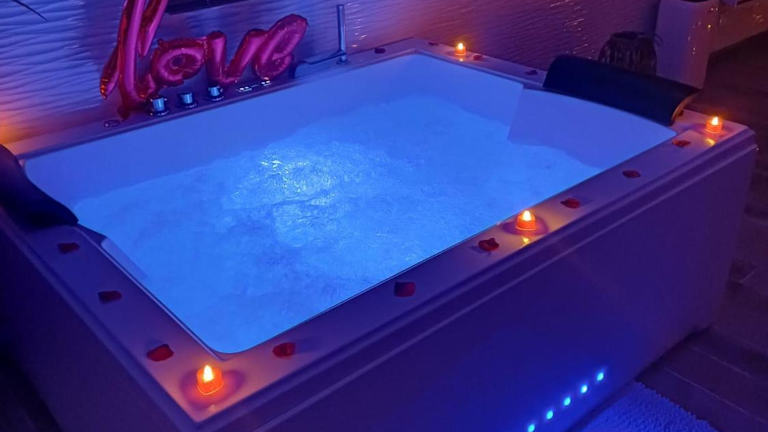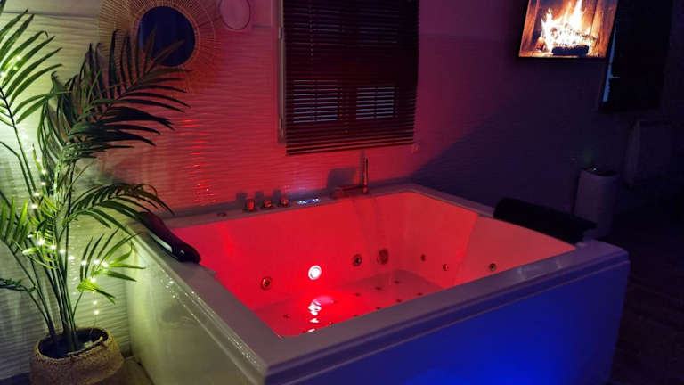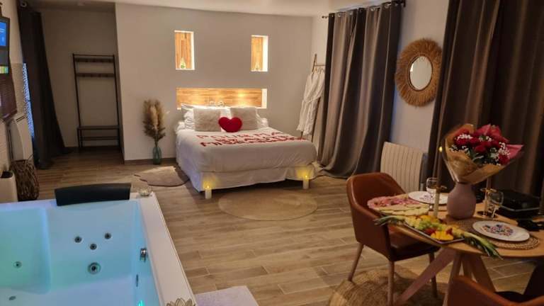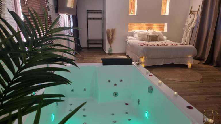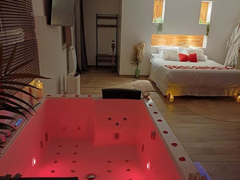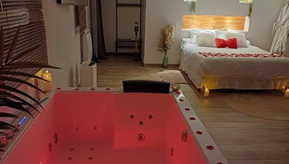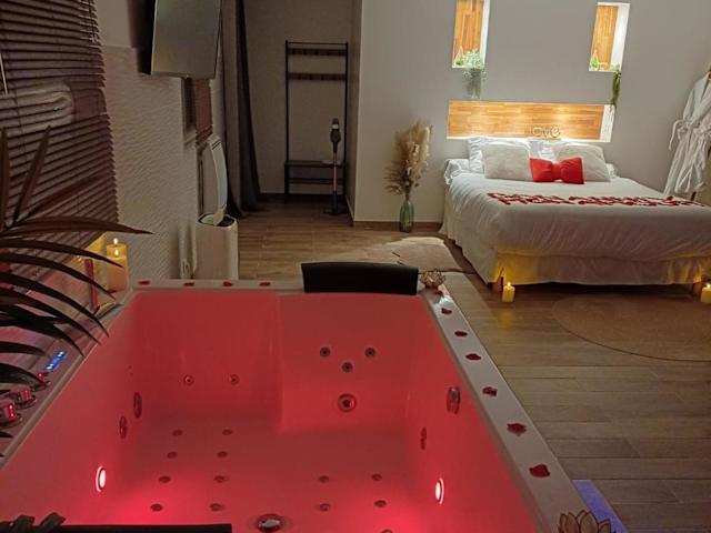 Die suite de charme avec jacuzzi privé L'évasion romantique ist eine ausschließlich für Erwachsene zugängliche Unterkunft, die in einer ruhigen Lage mit einem Garten, einer Terrasse und einer Bar eine entspannende Atmosphäre bietet. Die Unterkunft zeichnet sich durch Annehmlichkeiten wie einen Whirlpool, ein Spa-Center und kostenloses WLAN aus.