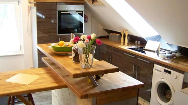 Die Ferienwohnung besteht aus einem Schlafzimmer, einem Wohnzimmer und einer voll ausgestatteten Küche, die mit einem Kühlschrank und einer Kaffeemaschine ausgestattet ist. Zudem gibt es ein Badezimmer mit Dusche und Badewanne. Handtücher und Bettwäsche werden bereitgestellt.