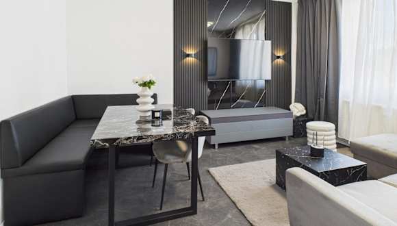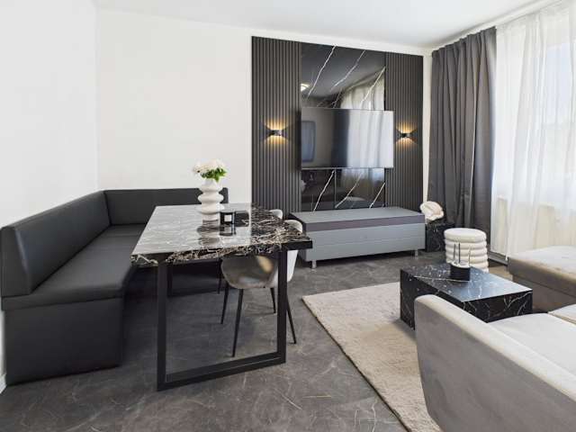 Die Ferienwohnung verfügt über ein Schlafzimmer, eine Küche mit Kühlschrank und Geschirrspüler, einen Flachbild-TV sowie einen Sitzbereich. Das Badezimmer ist mit einer Dusche ausgestattet. Handtücher und Bettwäsche werden bereitgestellt. Zustellbetten sind für Kinder ab 5 Jahren verfügbar, während Babybetten für Kleinkinder bis 3 Jahre bereitgestellt werden können.