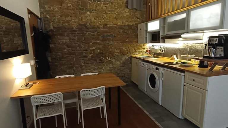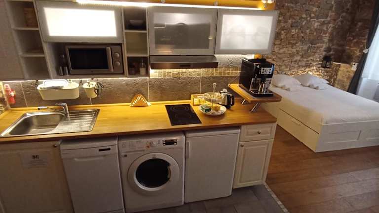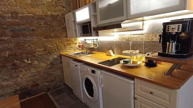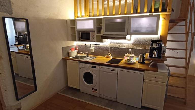 Die Unterkunft verfügt über eine vollständige Küchenzeile, die mit einem Kühlschrank, Geschirrspüler, Ofen, Mikrowelle, Herdplatte und Toaster ausgestattet ist. Darüber hinaus stehen eine Kaffeemaschine und ein Wasserkocher zur Verfügung, was eine eigenständige Zubereitung von Mahlzeiten und Getränken ermöglicht.